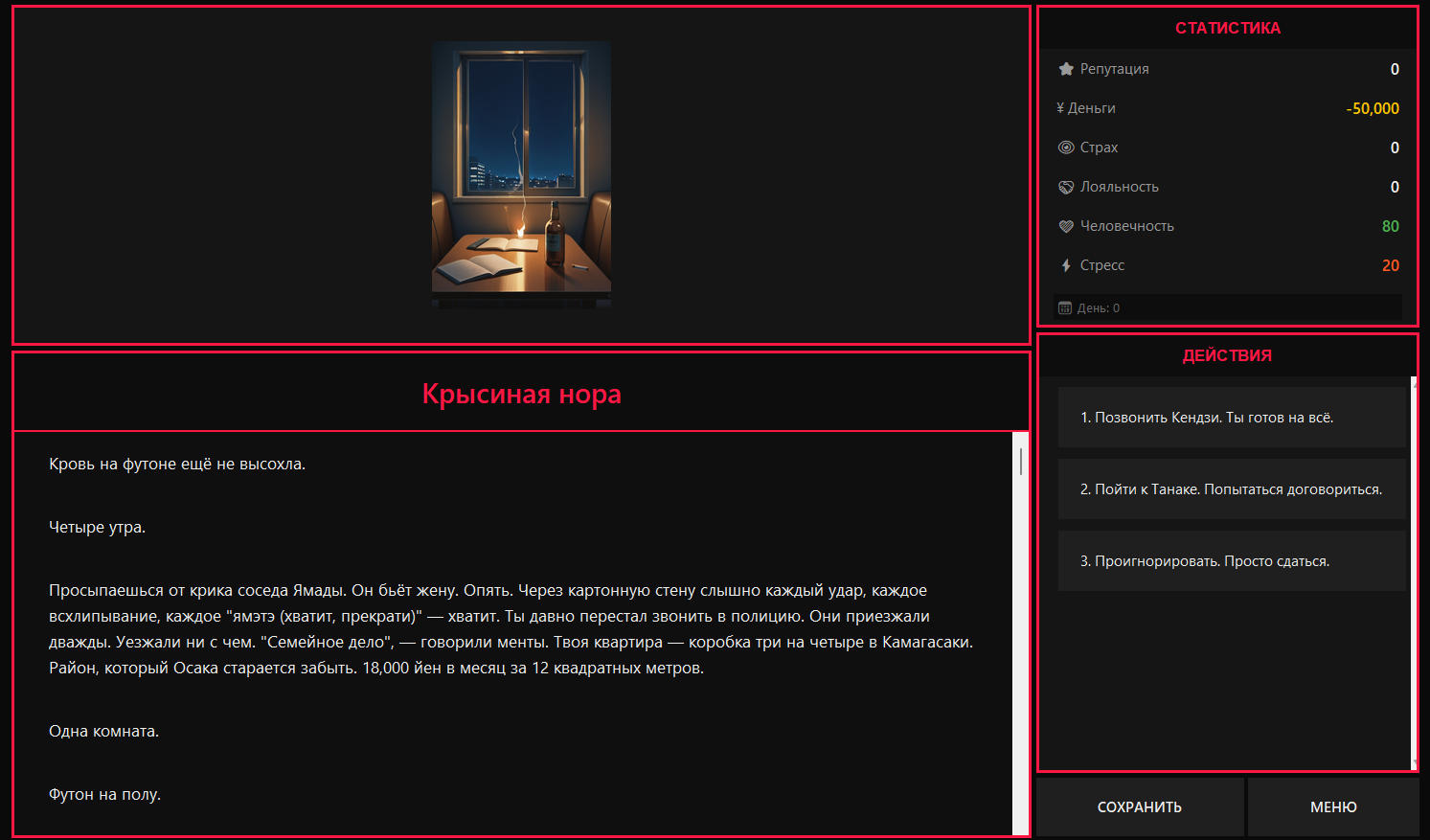 Стресс, усталость, страх и человечность напрямую влияют на доступные варианты, стиль текста и исходную сцену. -